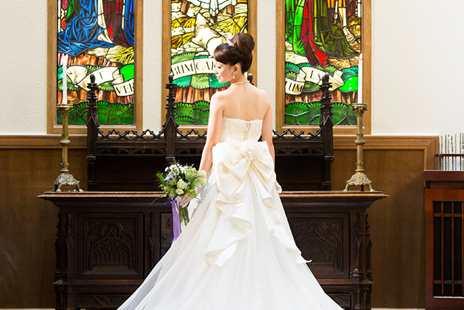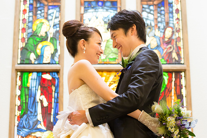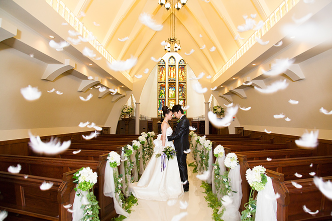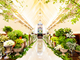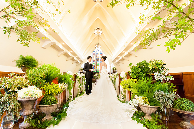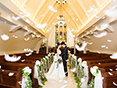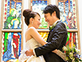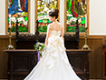 緑豊かなガーデンに立つ独立型チャペル。 本場イギリスから取り寄せた大きなステンドグラスや牧師台、椅子など「本物」にこだわったチャペルは アンティークならではの温かさを感じられる。 また、ステンドグラスから注ぐ光によって大理石のバージンロードに2人のシルエットが映る幻想的な空間に。 天使がお二人の永遠の誓いを祝福する「エンジェルシャワー」の演出も。