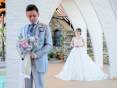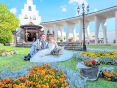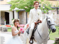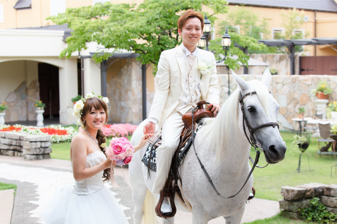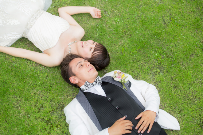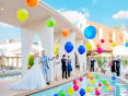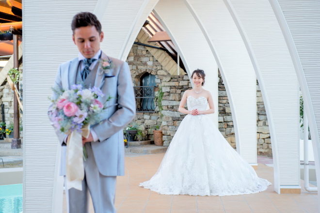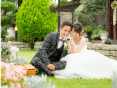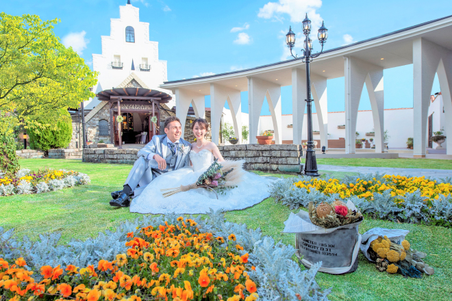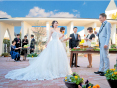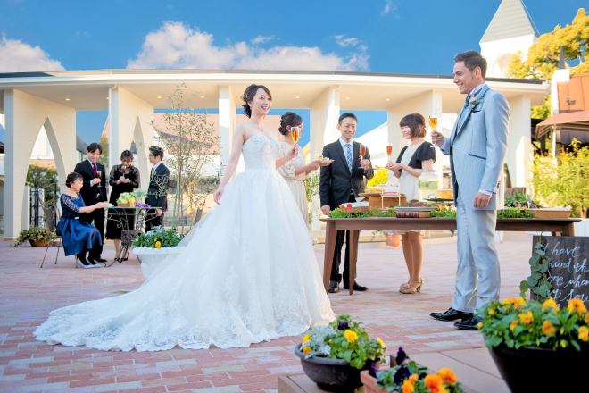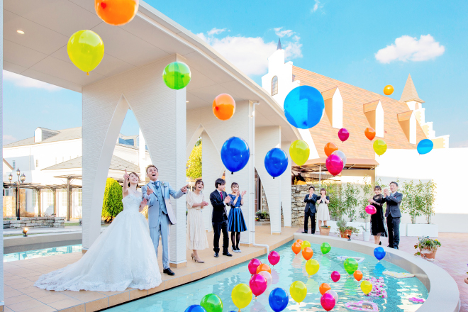 バルーンリリースやフラワーシャワーなど、青空の下では挙式後の演出も絵になる。